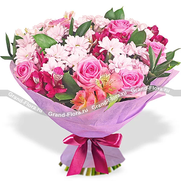 Стандартный: роза розовая - 5 шт, альстромерия розовая/сиреневая - 3 шт, хризантема кустовая светло-фиолетовая (возможна замена на белую) - 3 шт, рускус, упаковка, лента