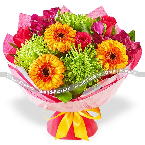 Стандартный: хризантема зеленая одноголовая "шамрок" - 3 шт., роза красная - 3 шт., гербера оранжевая - 3 шт., альстромерия фиолетовая - 2 шт., декоративная зелень, упаковка, лента.